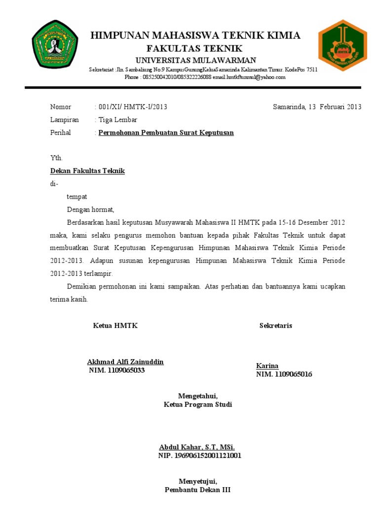 Permohonan sk kepada yth sehubungan dengan telah tersusunnya kepengurusan, kami mohon kiranya ketua umum hmi cabang purwakarta untuk menerbitkan sk kepengurusan himpunan mahasiswa islam komisariat stai muttaqien purwakarta serta melantiknya. 15 kumpulan contoh surat permohonan dana izin bantuan. Berikut kami berikan contoh surat keputusan (sk) penetapan pengurus paud. Sk pembentukan pengurus pasar desa adalah surat keputusan yang dikeluarkan oleh kepala desa untuk acuan tertib dan legal kepengurusan pasar desa tersebut. Agar permohonan tersebut dikabulkan maka kita.